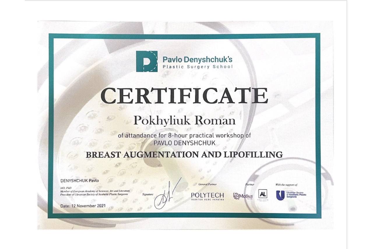 2022 р. – ПВНЗ «Київський медичний університет» курс спеціалізації з пластичної хірургії.